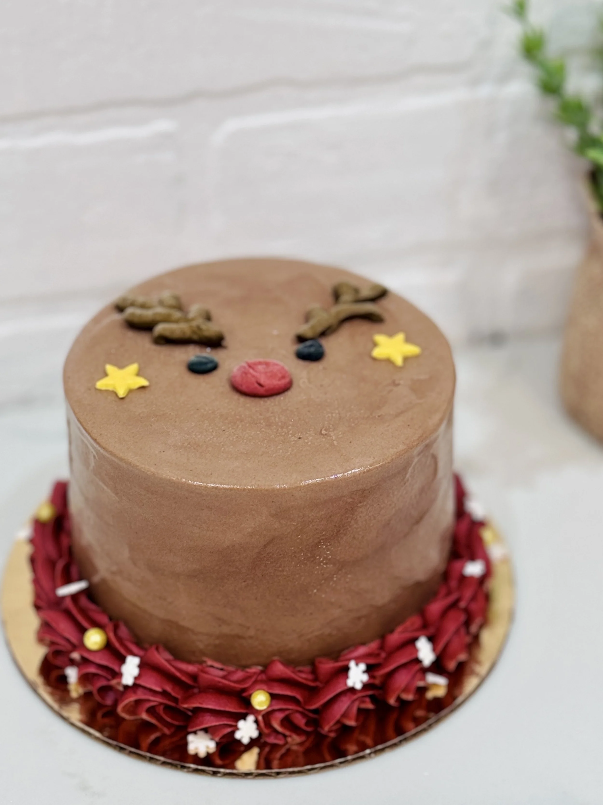 Delight in layers of indulgent chocolate and Oreo, frosted with rich cocoa buttercream that captures the playful spirit of the holidays. Topped with Rudolph's iconic red nose, edible antlers, and festive decorations, this charming cake is sure to be the centerpiece of your Christmas celebration and a hit with guests of all ages.