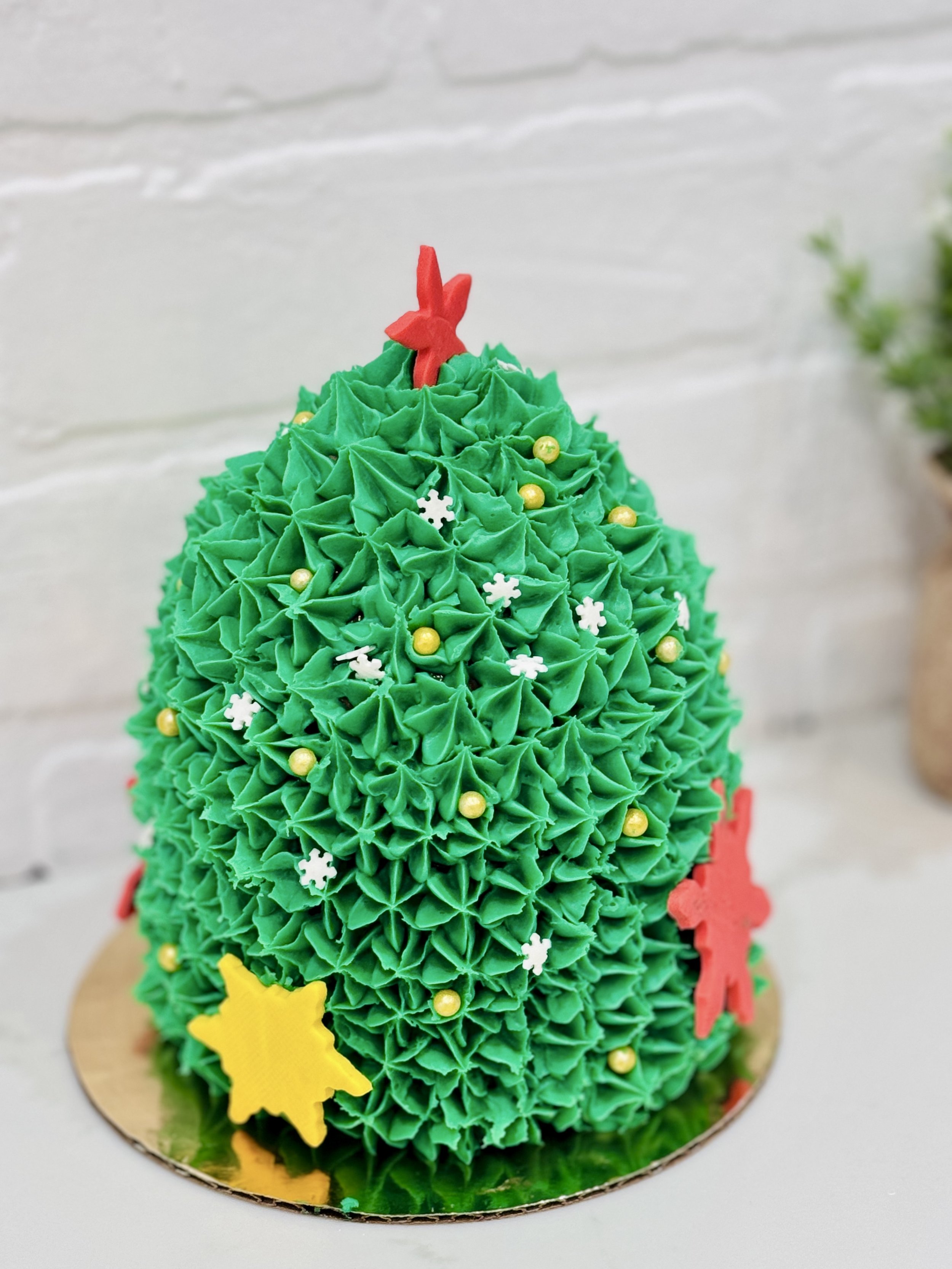 This holiday-inspired ice cream cake combines the seasonal flavors of strawberry, chocolate, and matcha ice cream, nestled in a whimsical design that mimics a Christmas tree. Adorned with vibrant decorations and a dusting of festive charm, it's a sweet, refreshing tribute to the joy and warmth of the season.